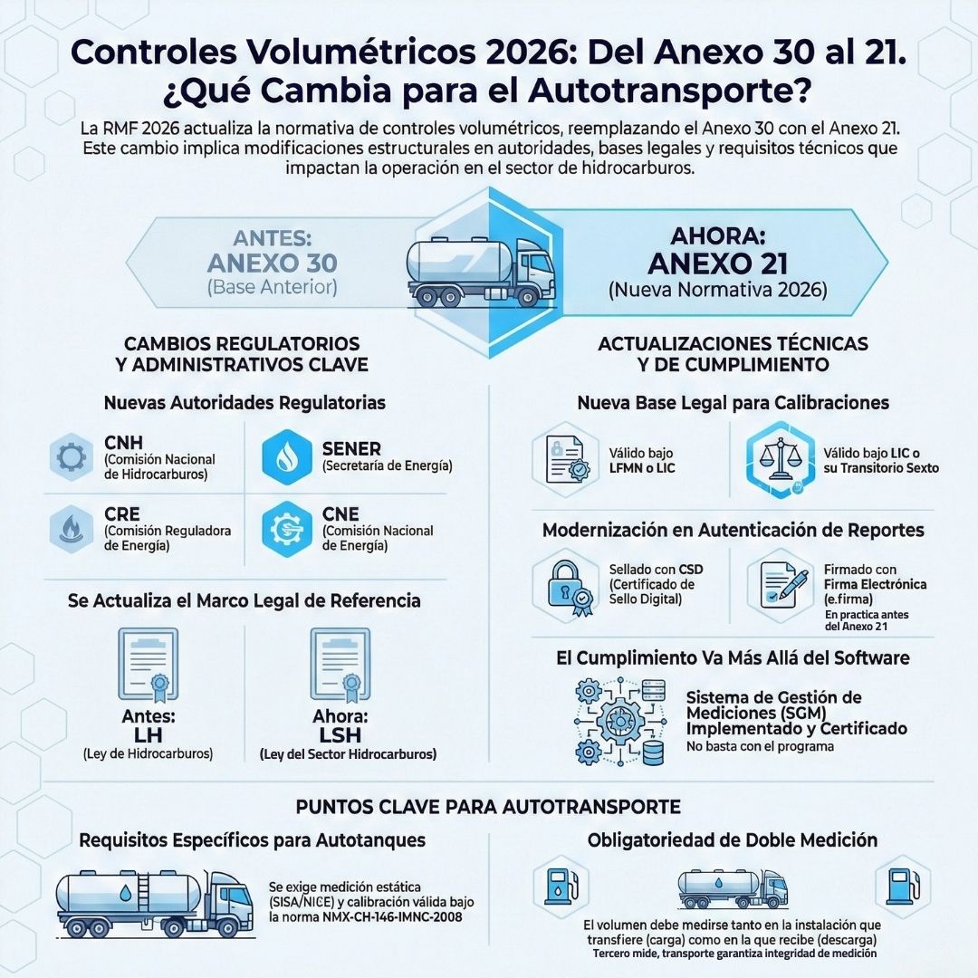 El paso del Anexo 30 al Anexo 21 en la RMF 2026 representa mucho más que un cambio cosmético. Las modificaciones en autoridades competentes (CNH→SENER, incorporación de CNE), actualizaciones legislativas (LSH) y cambios técnicos (LIC, firma electrónica) demandan una revisión integral de los procesos de control volumétrico.